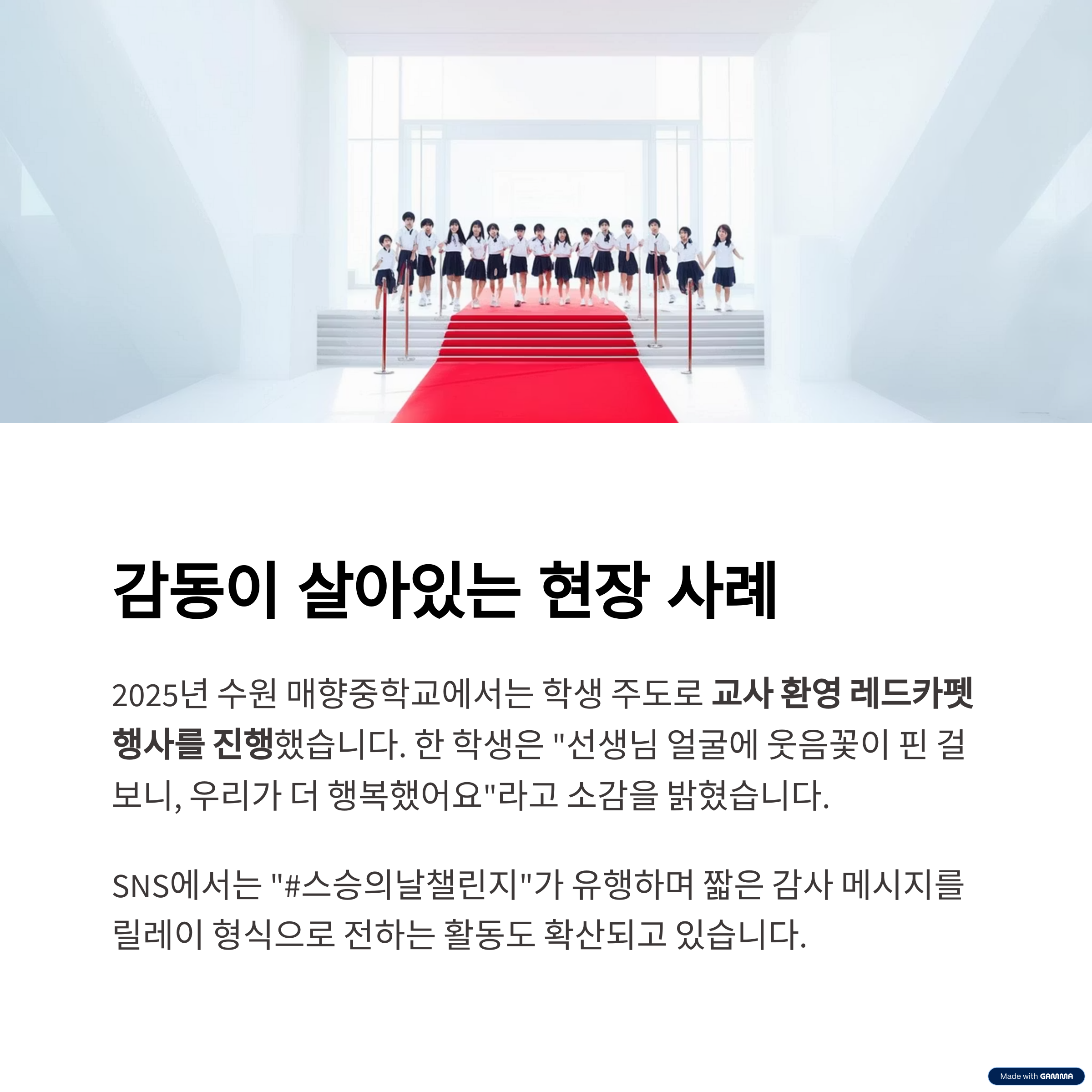 2025년 수원 매향중학교에서는 학생 주도로 교사 환영 레드카펫 행사를 진행했습니다.