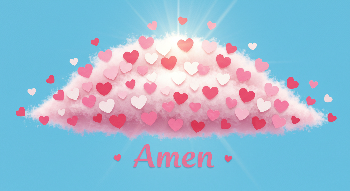 이미지 속 "하늘에 하트 구름과 '아멘'이라는 문구"는 이 구절의 본질을 유쾌하게 표현합니다.